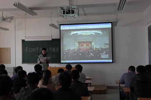 3月27日下午,机械学院学生第四党支部在临潼校区10-501教室,举行了学习国务院总理温家宝2012年政府工作报告的组织生活会,会议由党支部书记张立显主持。张立显首先向全体学生党员解读了国务院总理温家宝2012年政府工作报告全文,然后和学生党员们一起讨论了相关热点问题,强调了学习2012年政府工作报告的重要意义。整场组织生活会热情高涨,全体学生党员纷纷表示,在以后的工作中要勤奋工作,为社会主义建设贡献自己的力量。