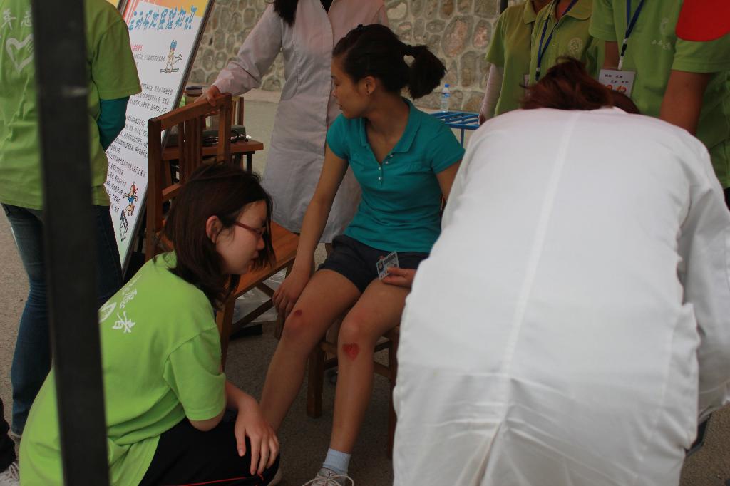 (我院志愿者协同医生为受伤运动员清洗伤口)