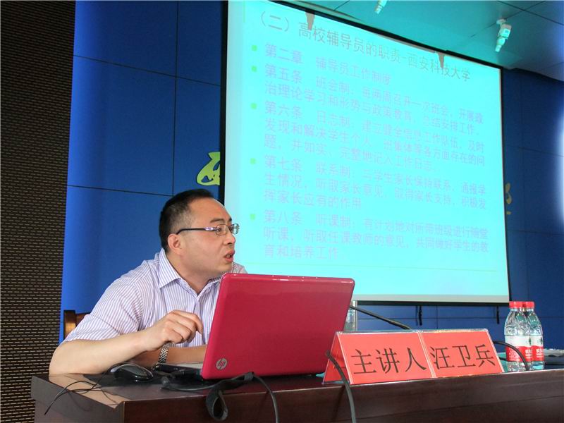 5月10日上午,校党委学工部在临潼校区第二会议室举办西安科技大学2012年辅导员培训会,我院分党委副书记汪卫兵应邀担任主讲,作了题为《学生工作视野下辅导员队伍之团队精神和团队建设》的报告。西安科技大学全体辅导员参加了培训。