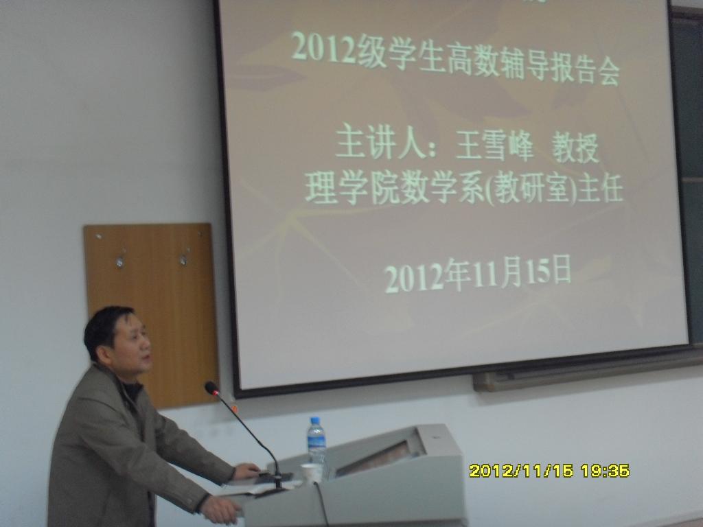 于11月15日晚,在9教105室由理学院数学系(教研室)主任王雪峰教授主讲的机械工程学院2012级高数辅导报告会顺利召开,出席此次大会的有我院党委副书记汪卫兵,2012级辅导员老师李彩虹、程鹏。
