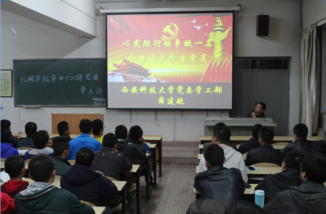 11月14日晚,机械工程学院初级党校培训第三讲在3#307举行。本次党课由西安科技大学党委学工部薛建航老师讲授。来自机械学院各个专业的积极分子等优秀学生参加了此次培训。