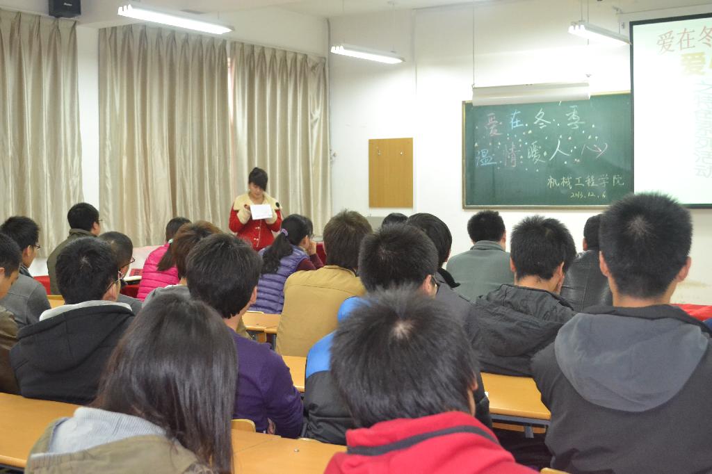 12月6日,机械工程学院“爱在冬季,温情暖人心”主题关爱贫困生特色系列活动在十教502隆重举行,本次活动秉承我院长期坚持的用爱温暖和激励贫困生成长成才的宗旨,通过给贫困生发放保暖内衣的形式给贫困生送来切实的温暖,展现机械学院对贫困生的重视与关心,从而培养我院学生浓烈的感恩意识以及自尊、自爱、自律、自强的优良品格。活动由院资助工作部主要负责,主管我院资助工作的12级辅导员程鹏老师主持本次活动,校资助管理中心刘红艳老师、院团委书记陈霂老师、11级辅导员芮智刚老师、12级辅导员李彩虹老师以及13级辅导员张立显老师也出席参加了本次活动。