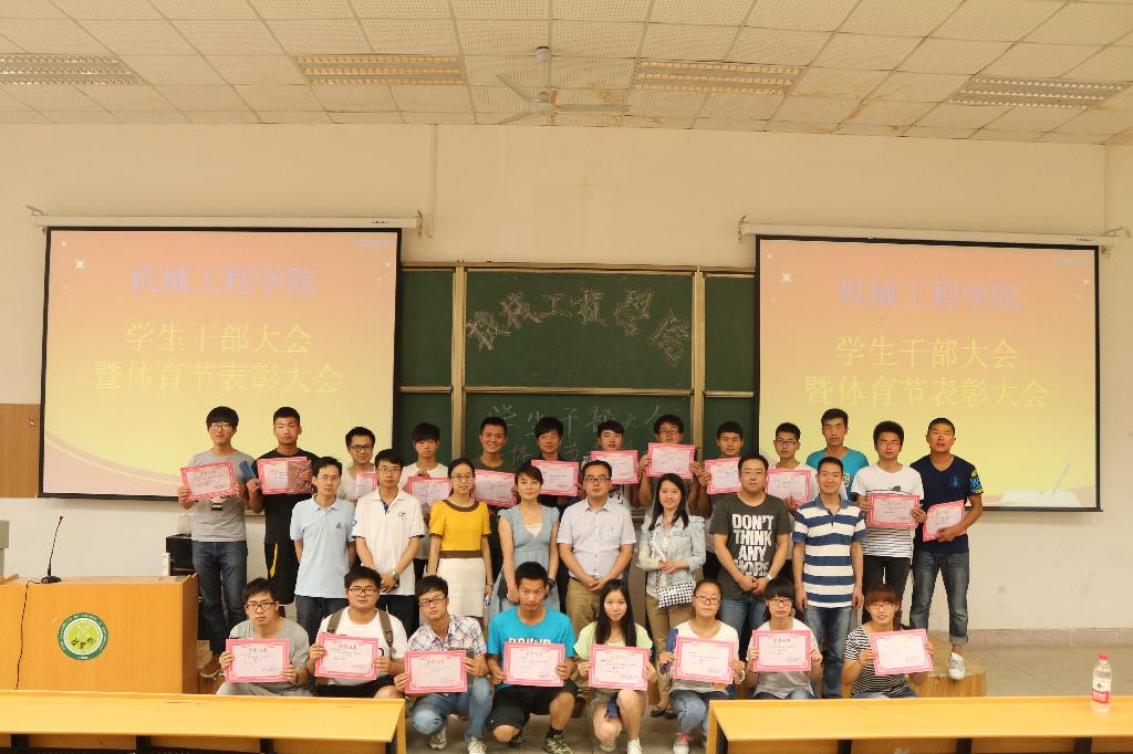 按照会议流程,首先由院党委副书记李婉丽老师宣读了“机械工程学院关于2014年体育节的表彰决定”,共评选出10个优秀集体奖、3个集体项目优秀团队奖、10个最佳运动员和19个优秀工作者。接着,由莅临此次大会的各位老师为最佳运动员和优秀工作者颁发奖品及证书。最后,由芮智刚老师传达了学工部的近期通知。会议结束后,获奖人员邀请了莅临此次会议的老师合影留念。