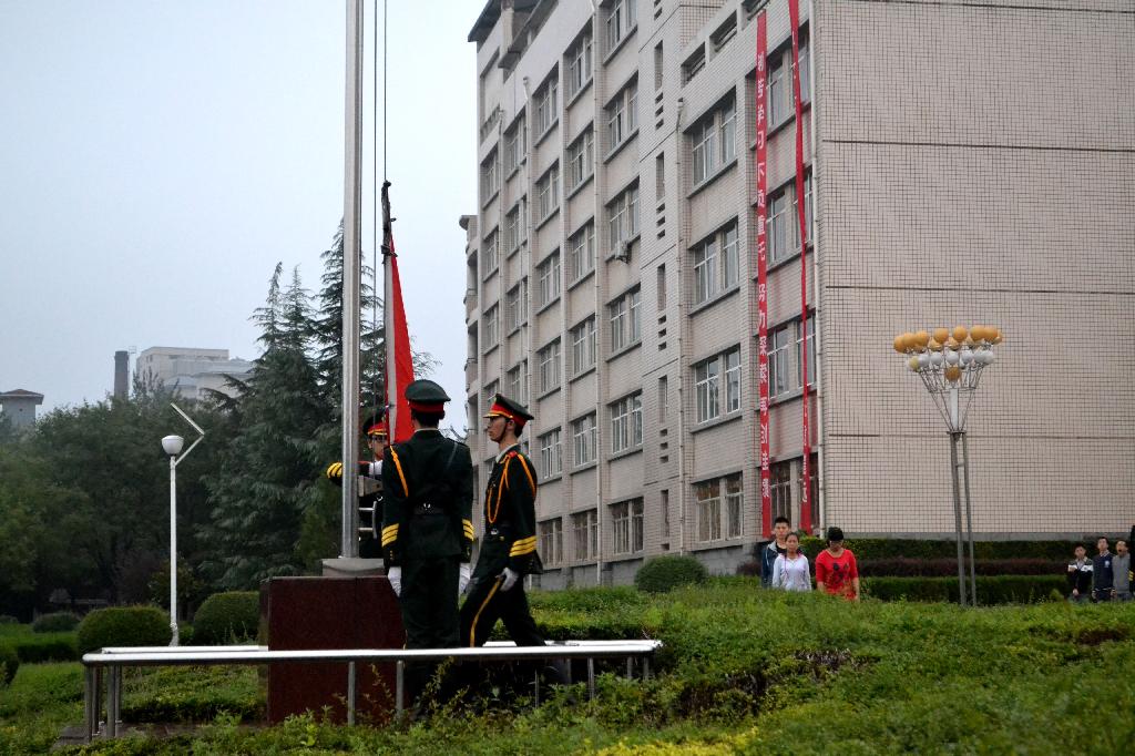 7点整,参加早晨操课训练的军训学生及教官全部停止训练,伴着庄严的国歌声,全体师生行注目礼,目视五星红旗徐徐升起。随后,学生代表田秋进行了题为《讲文明,习礼仪,重修养》的国旗下演讲,希望同学们共同努力,努力践行社会主义核心价值观,争当优秀大学生,为实现中华民族伟大复兴的“中国梦”而努力奋斗。