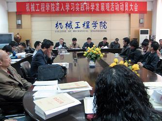 会议由机械学院院长郭卫主持。会上,学院分党委书记王学礼传达了校党委书记刘德安在校“开展深入学习实践科学发展观活动动员大会上的讲话”精神,并对学院学习实践活动作了全面动员。学院分党委副书记汪卫兵对机械学院深入学习实践科学发展观活动作了总体部署。学院本次学习实践活动的具体目标为“明确学院发展思路、解决学院突出问题、创新工作机制、促进学院科学发展”。活动载体为“强化学科特色,加强过程管理,努力提高人才培养质量”。结合学院的实际情况,本次学习实践活动从影响机械学院学科建设的瓶颈问题、提高师生员工积极性问题、加强干部工作作风等方面开展调研与思想大讨论。