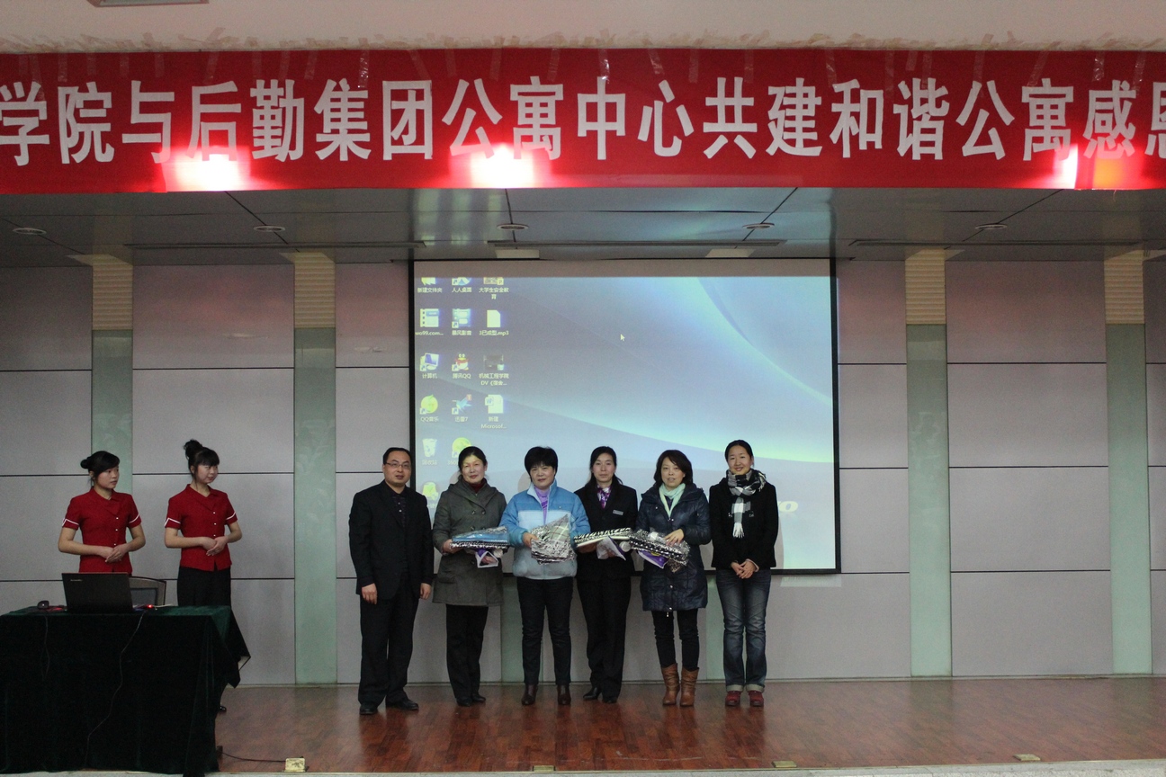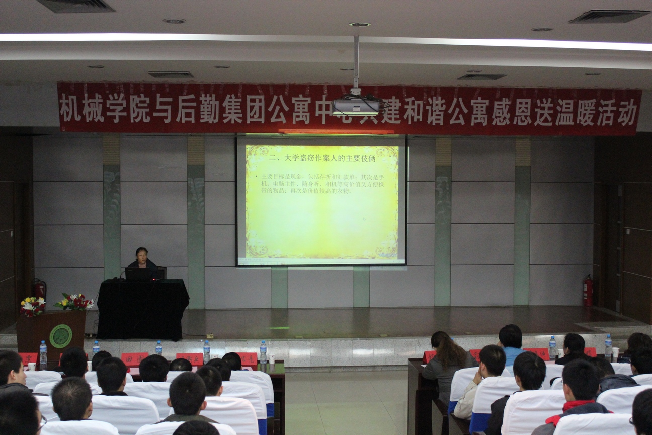 活动中,丁里主任做了题目为《大学生宿舍安全》的报告,围绕防盗、防火等内容展开了详细的讲解,通过案例分析,指出了维护宿舍安全的几条措施。接着,汪副书记与田园主任为宿舍管理员代表赠送了我院受助贫困生的爱心纪念品。石处长代表后勤集团发言,他强调了宿舍安全的重要性,希望学生能够共同维持好自己的宿舍,重视宿舍安全。