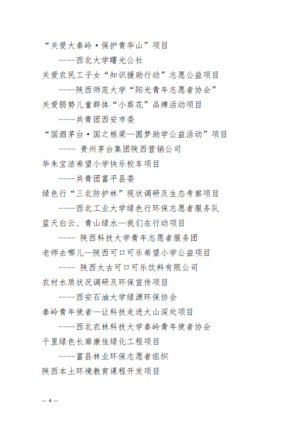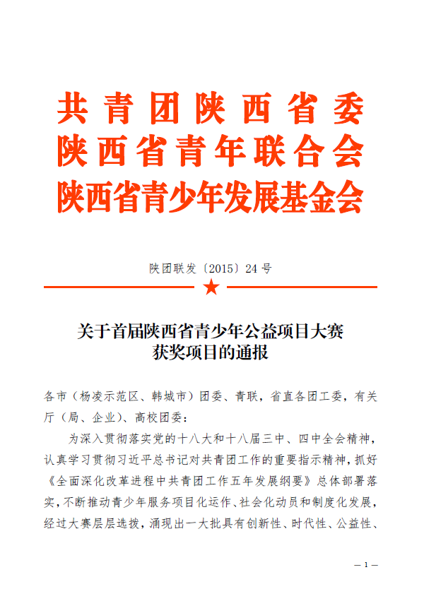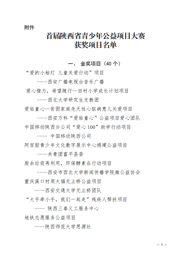 本次大赛由团省委、省青联、省青少年发展基金会主办,以“青春公益行共筑中国梦”为主题,分为志愿服务、生态环保、希望工程、高校公益项目和其他类别五大类,由各市级团委、高校团委选送相关公益项目。活动从今年3月初启动至4月30日,共有260个单位和社团申报公益项目287个,经过初评,有200个公益项目进入复评,专家综合评审后,最终遴选出“爱的小桔灯·儿童关爱行动”项目等40个金奖,“爱心助长——公益志愿行”项目等60个银奖,“爱心手牵手,共圆中国梦”项目等100个铜奖公益项目。获奖项目将在陕西省青少年发展基金会官网进行线上推广。