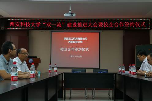 2018年9月14日上午,汉江机床有限公司人力资源部部长马新礼一行两人赴机械工程学院签署汉江机床有限公司-西安科技大学校企合作协议,签约仪式在临潼校区机械学院会议室进行,仪式前双方就人才培养、本科实习基地、科研项目合作等议题进行了友好深入的交流,并由汉江机床有限公司马部长与机械学院院长张旭辉分别代表两家单位签署了合作协议。参会的学院领导有机械学院党委书记汪卫兵、院长张旭辉、副院长寇发荣、党委副书记李婉丽、副院长赵栓峰,学院30余名师生也参加了签约仪式。