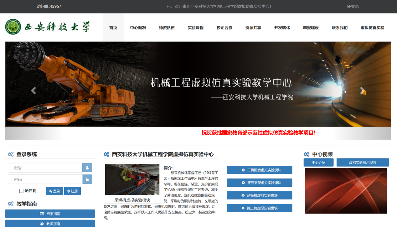 机械学院实验中心最早可追朔到1958年的矿山机电实验室,2007年获批陕西省机械工程实验教学示范中心,2017年获批陕西省虚拟仿真实验教学中心,2018年“煤矿综采综掘机械虚拟仿真实验”获批教育部首批虚拟仿真实验教学项目。