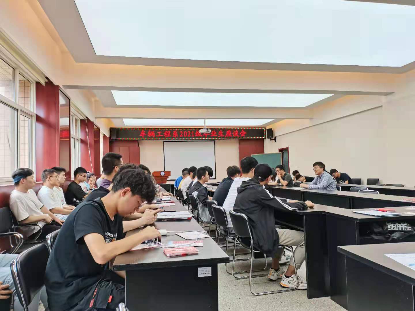 6月18日下午,车辆工程系在临潼校区骊山校园机械工程学院会议室召开2021届毕业生座谈会。学院党委副书记尹弘、副院长赵栓峰,车辆工程系主任高怀斌、党支部书记王忆佳,车辆工程专业2017级毕业生代表,车辆工程专业2018级、2019级、2020级学生代表70余人参加。座谈会由车辆工程系主任高怀斌主持。