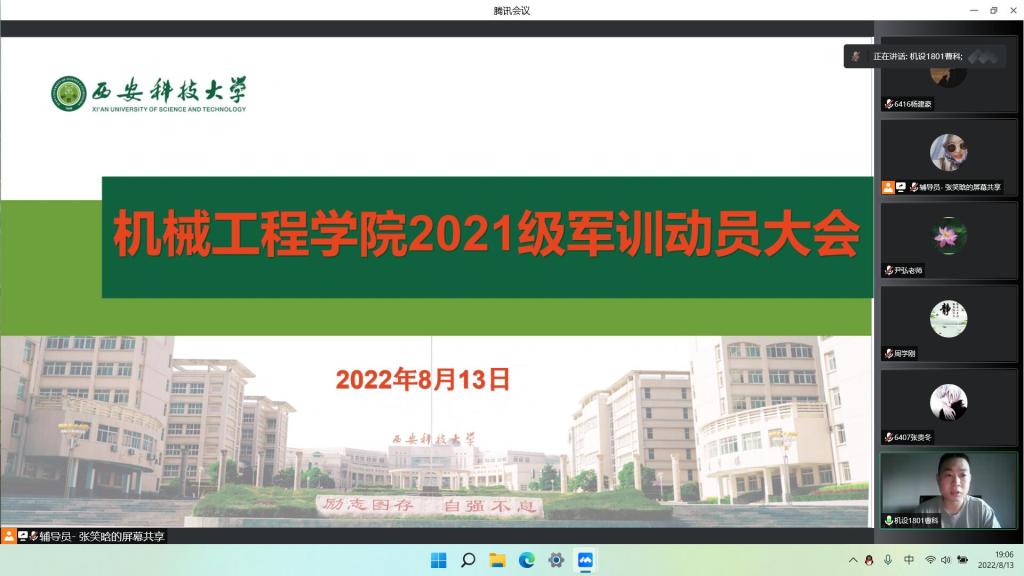 8月13日晚,机械学院召开线上2021级军训动员大会,学院党委书记张金来、院长曹现刚、党委副书记尹弘、副院长钟斌、2021级辅导员张笑晗、退役复学学生代表(2022届毕业生曹科、2020级在校生霍云疆)以及2021级全体参训学生参加会议。会议由学院学工办主任、团委书记周学刚主持。