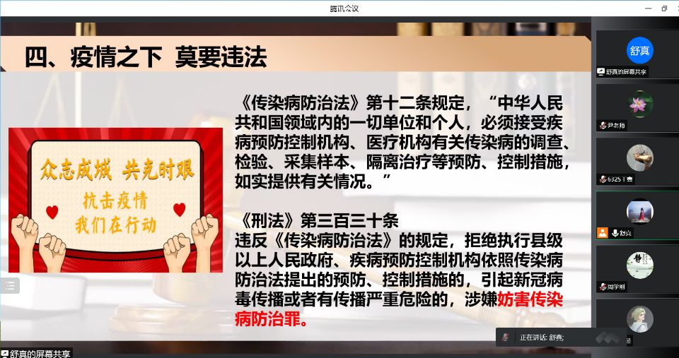 报告会主题为《知法于心 守法于行》,内容生动,案例丰富,指导性强。舒教授围绕“追根溯源,良法善治”“积极维权,化解纠纷”“防微杜渐,远离犯罪”“疫情之下,莫要违法”四个方面展开讲授。介绍了法的词源演变,讲解了“法的概念”“法的特征”,通过大量生动典型的案例,对“法制与法治”“违法与犯罪”等不同概念做了解析;结合《民法典》和典型案件告知学生应有的民事权利和侵权责任,并就校园贷、网购权益、大学生盗窃、网络舆论犯罪等内容指导大学生应如何维护自身权益。结合《传染病防治法》《刑法》《治安管理处罚法》等有关内容,对疫情防控中“纳入核酸检测范围的人群,无故不参加统一组织的核酸检测”等的违反相关规定和要求会承担何种法律责任做了全面的介绍。最后,对同学们进一步提高法律意识,遵纪守法,维护自身合法权益提出中肯的意见和建议。