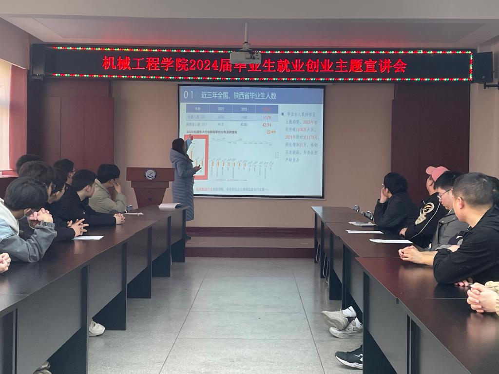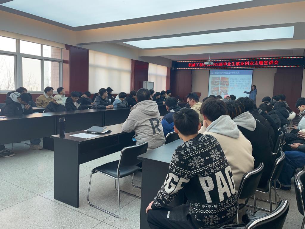 根据《陕西省教育厅关于做好 2024 届全省普通高校毕业生就业创业工作的通知》精神,为进一步落实中、省关于高校毕业生就业创业工作的决策部署。1月12日中午,机械工程学院组织开展2024届毕业生就业创业主题宣讲,机械工程学院党委副书记尹弘作了宣讲,毕业班辅导员杨芝主持,毕业班辅导员骆佳录及24届未就业毕业生共百余人参加。
