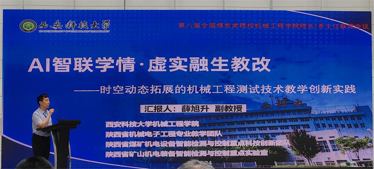 会议聚焦“新工科背景下机械工程学科高质量发展与教学创新实践”主题,通过主旨报告、专题研讨、教学竞赛等形式展开交流。西安科技大学机电工程系主任薛旭升副教授在大会上作了题为“AI智联学情·虚实融生教改——时空动态拓展的机械工程测试技术教学创新实践”专题报告。报告从人工智能技术赋能教学改革、虚实融合教学模式构建、学情动态分析与课程时空拓展等维度,系统展示了西安科技大学在机械工程测试技术课程中的创新探索与实践成效,同与会学者开展了热烈讨论。