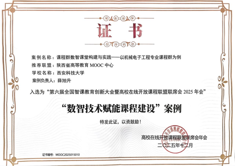 近日,从高校在线开放课程联盟联席会获悉,西安科技大学机械工程学院申报的“课程群数智课堂构建与实践——以机械电子工程专业课程群为例”教学成果(案例负责人薛旭升副教授),经严格遴选入选“第六届全国智课教育创新大会暨高校在线开放课程联盟联席会2025年会”数智技术赋能课程建设优秀案例。
