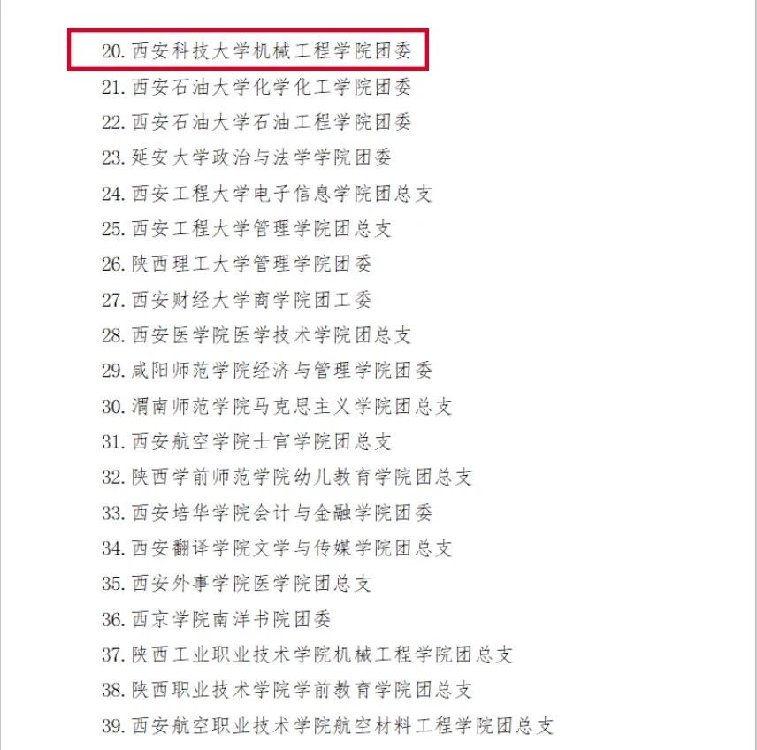 2020年5月13日,由共青团陕西省委办公室,中共陕西省委教育工委办公室公布的关于第一批全省高校团建示范院校,标杆院系,样板支部培育创建名单中,西安科技大学机械工程学院团委被评为“全省高校团建标杆院系”。