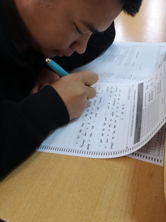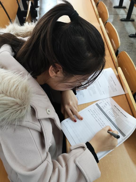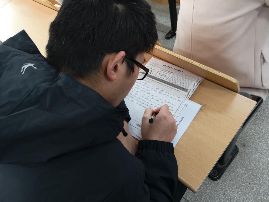 这次考试完全模拟正式考试的流程,学生在有人监考,杜绝手机的环境下,训练自己的答题能力。考试内容包括听力、阅读、写作、翻译四种题型。考试考风严正,纪律严明。考试过程中,学生们全神贯注,埋头做题,考场气氛严肃。
