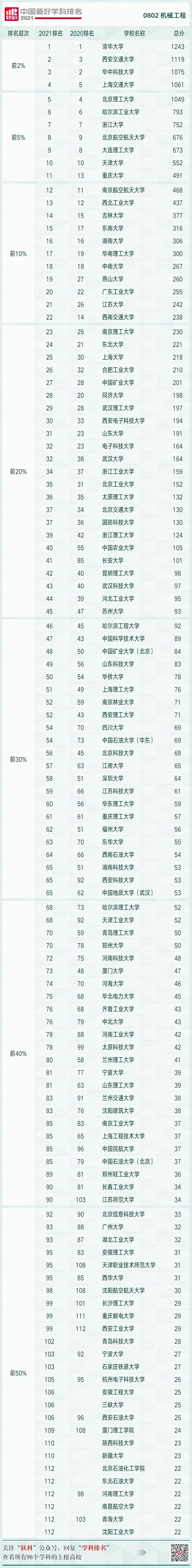 2021年10月25日,高等教育评价专业机构软科正式发布“2021软科中国最好学科排名”。机械工程学科排名共有117所大学上榜,西安科技大学机械工程学科排名第65位,进入软科排名前30%,相比2020年上升27位(2020年软科排名第92位)。完整排名名单如下: