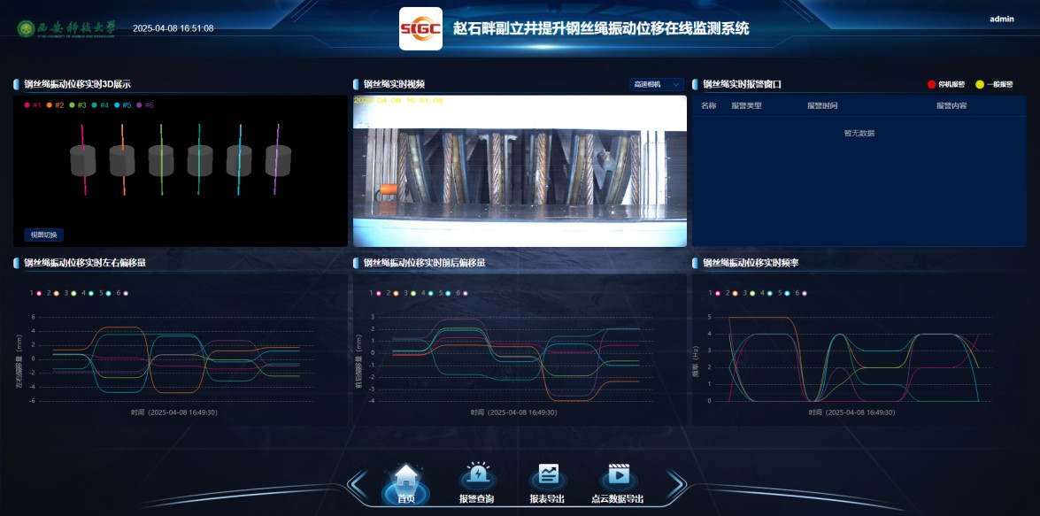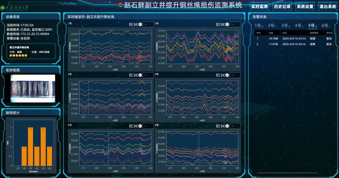 近日,由西安科技大学与陕西能源赵石畔矿业运营有限责任公司共同研发的矿井提升钢丝绳损伤与振动在线监测系统在赵石畔煤矿JKM-4.6×6(P)型井塔式多绳摩擦提升机成功应用,并顺利通过专家组验收。该项目为我校承担的陕西能源赵石畔矿业运营有限责任公司重点科技创新项目,由机械工程学院副院长毛清华教授牵头实施。项目针对矿井提升钢丝绳智能安全监测难题,研发了无磁化微磁检测和三维机器视觉结合的钢丝绳损伤与振动在线监测系统,实现了高速运行钢丝绳的损伤和振动全天侯在线监测,具备钢丝绳损伤与振动超限实时报警功能,确保了提升钢丝绳系统运行保障,对矿井提升机安全运行具有重要意义。