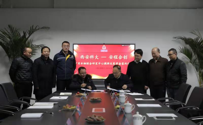 双方希望通过深度校企合作,产学协同,共建共享,共赢发展。随后,张旭辉院长与党树仓董事长在全场热烈的掌声中签署奖学金协议,并共同为"西安科技大学-陕西安程合创设备有限公司矿用车辆联合研发中心"和“校企合作人才培养基地”揭牌。最后,与会人员参观了矿用新型防爆车辆研发制造车间,探讨了矿用防爆车辆防护改造、智能化生产、新能源等方面的技术难题。