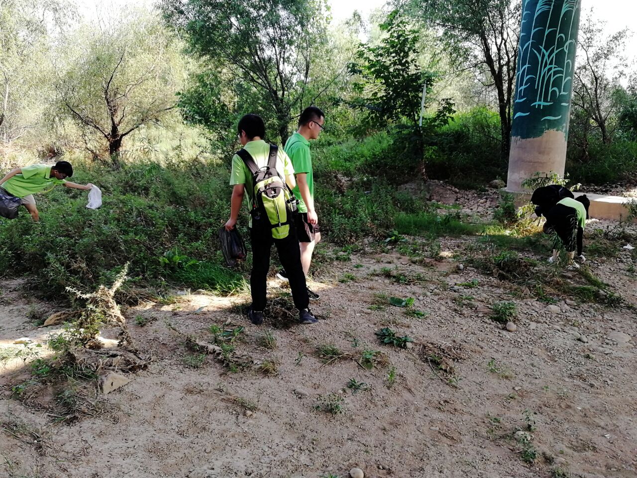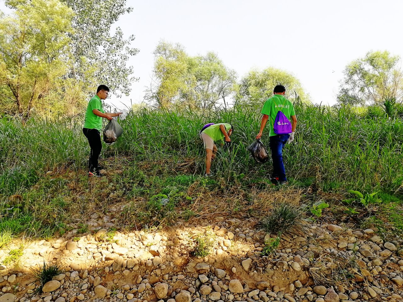早上环保志愿者们在团队老师李帅田的带领下来到了湿地公园,由于此处为公园,所产生的垃圾大多是公众不经意间落下的塑料水瓶或者纸巾。实践队员人手一个黑色塑料袋,带着专业捡垃圾手套,沿着灞河旁边的小路,队员通过自己的寻找,找到了许多被遗弃的垃圾。还通过一条小路下到了灞河边上,打捞了些许沿水漂流的垃圾。保护了水质的清洁。